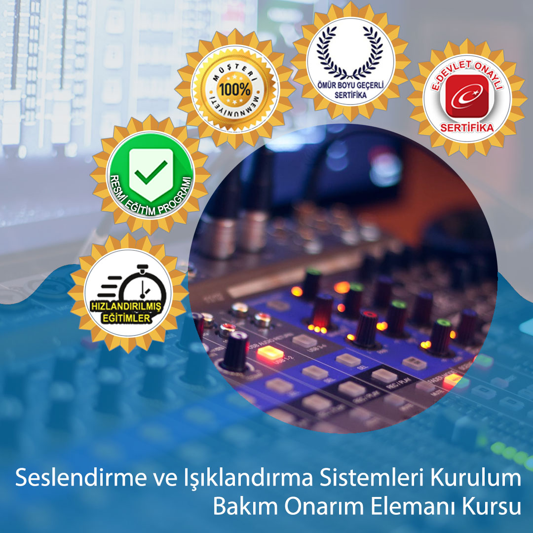 Seslendirme ve Işıklandırma Sistemleri Kurulum Bakım Onarım Elemanı mesleğine yönelik olarak verilen kurs sonundaki kurs bitirme sınavı uzaktan eğitim sistemimiz tarafından yapılır. Sertifika sınavına katılan ve kursiyerler 100 puan üzerinden 45 puan ve üzeri puanlar aldığında başarılı olarak sayılır ve Seslendirme ve Işıklandırma Sistemleri Kurulum Bakım Onarım Elemanı bitirme belgesi (Sertifikası)” almaya hak kazanır. Kurum tarafından hazırlanan sertifikalar Üniversite tarafından onaylandıktan sonra teslim edilir. Sertifikanın teslim tarihi 7 işgününü aşmamaktadır.